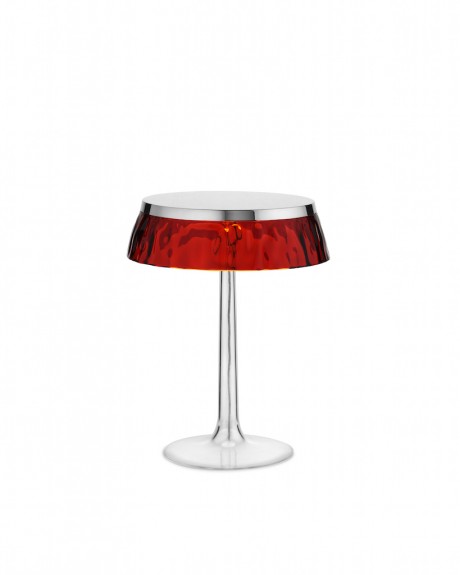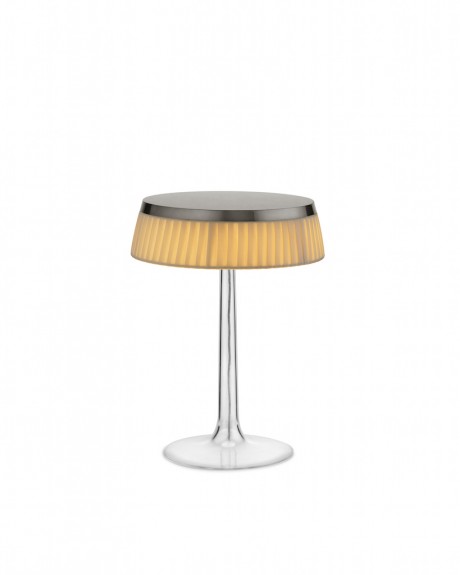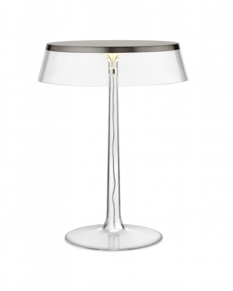 Bon Jour è una famiglia di lampade che si caratterizza per il corpo etereo, puro, quasi immaterico. Una base nuda, trasparente, personalizzabile a seconda del gusto e dello stile di ognuno, ‘vestendola’ con un cappello in alluminio galvanico in cromo o rame, che incorpora la fonte a LED, e un paralume disponibile in diverse finiture e materiali: in plastica a iniezione color ambra, come i vecchi vetri molati, o trasparente gialla, più contemporaneo e high tech: in tessuto plissé o in rafia naturale, e così via.
