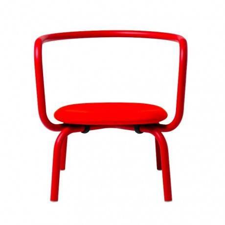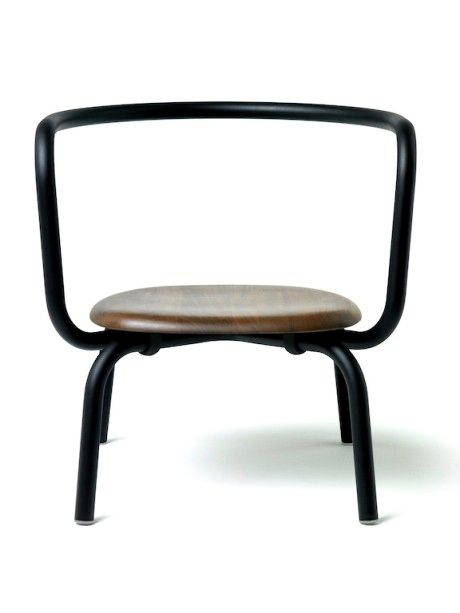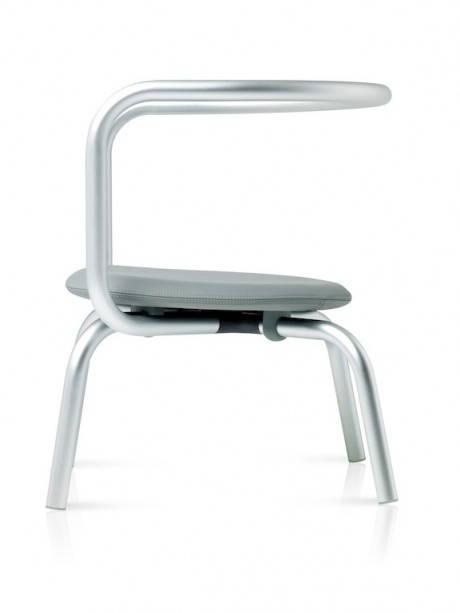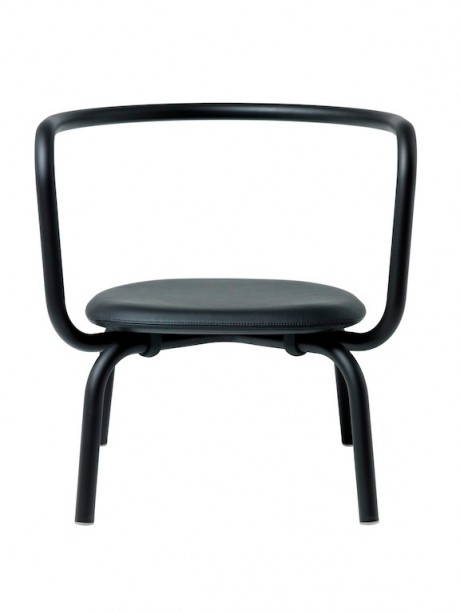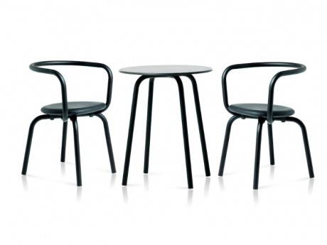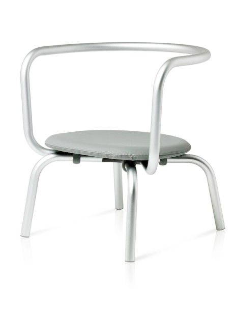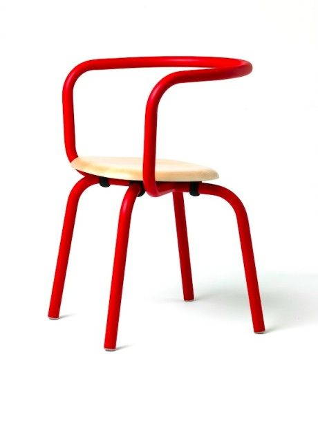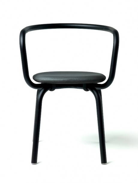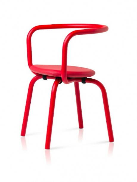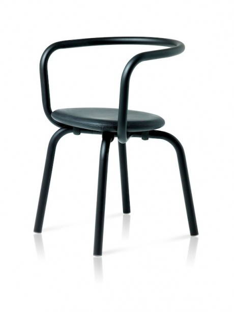 “La sedia presenta una seduta generosa contornata da un tubolare d’acciaio il quale crea una sorta di cintura che delimita lo spazio attorno all’utilizzatore, uno spazio in cui ci si può sentire protetti”, afferma Konstantin Grcic.