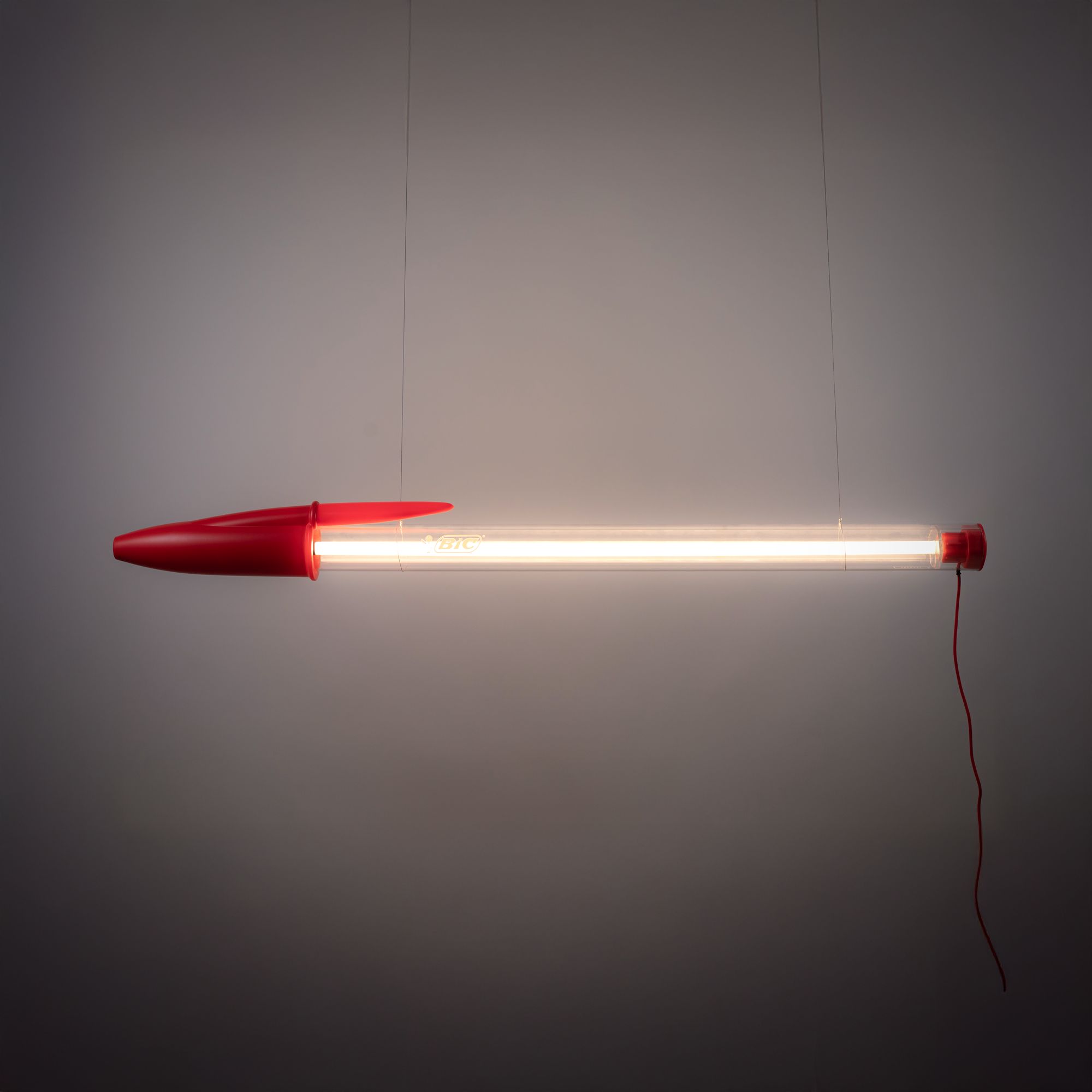 La forza della Lampada Bic sta nella sua fedeltà. È una BIC Cristal ingigantita in scala 12:1, riprodotta con un’attenzione quasi filologica ai dettagli: cappuccio, clip, fusto trasparente. Solo che al posto dell’inchiostro troviamo una sorgente LED che la trasforma in lampada da terra, sospensione o applique. Tre le versioni cromatiche: nero, blu e rosso, esattamente come nell’immaginario collettivo. Perché il punto non è reinventare l’icona, ma amplificarla. Farla entrare nello spazio domestico come presenza familiare e, allo stesso tempo, destabilizzante.