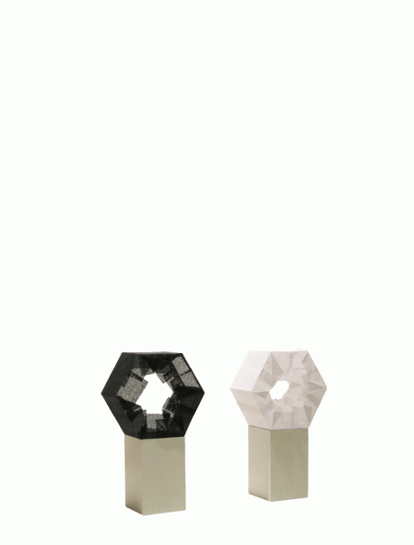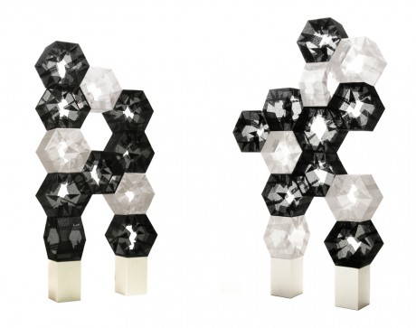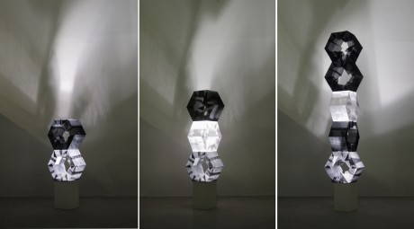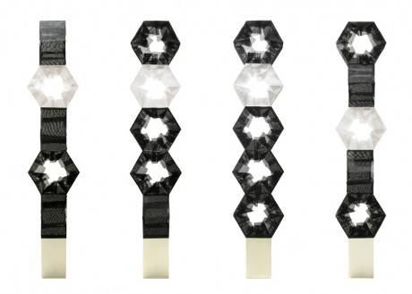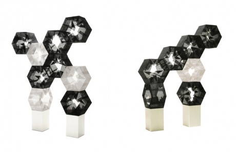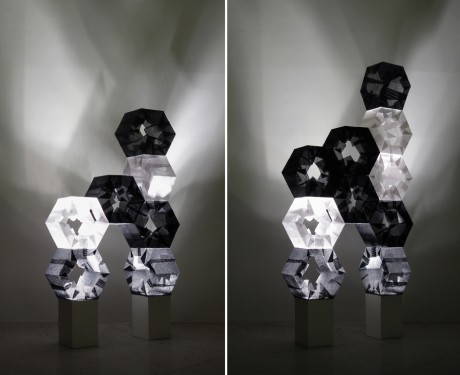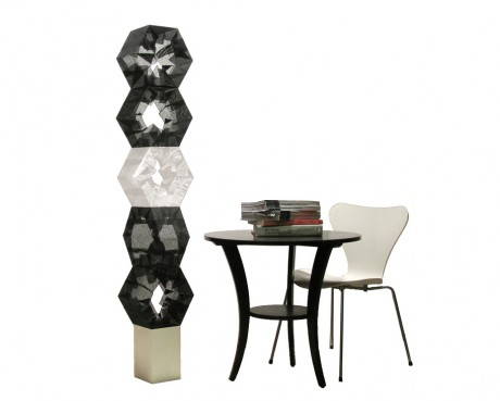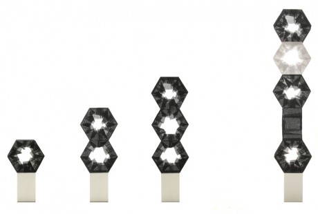 Esistono due configurazioni di base; la prima ha la forma di una torre con una singola sorgente di luce, mentre l’altra ha due sorgenti luminose in basso, collegate tra loro da una struttura a ponte fatta di elementi esagonali. Gli elementi “paralume” sono disponibili in due colori, bianco e nero, e possono essere abbinati in diverse maniere fino a un massimo di 5 unità. La fonte di illuminazione è contenuto nel box di base e la luce, attraversando i vari elementi, proietta contro le pareti crea ombre dinamiche e sempre diverse.