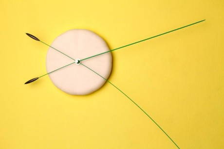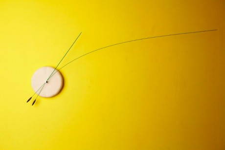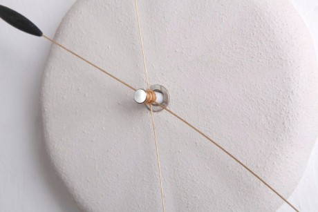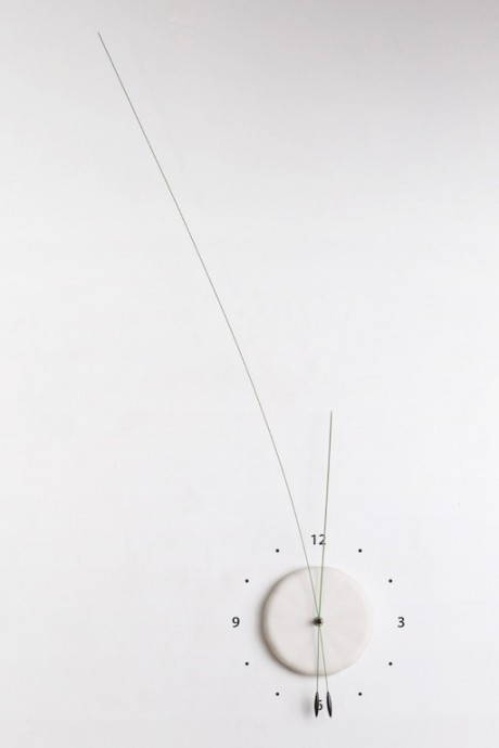 La base è realizzata in ceramica. Le lancette sono in filo d’acciaio disponibili in vari colori. Nella configurazione di base le lancette hanno un color verde erba, ma possono anche essere “deep orange” oppure nella più ricercata finitura oro. O, a richiesta, in qualsiasi altro colore. Anche la base è personalizzabile sia nella forma, sia nel colore, sia nell’inserimento eventuale di incisioni. Lo Studio Ve ha una vera e propria predilezione per gli orologi. Suo è anche il Manifold Clock, un altro modello con le lancette “vestite” che sembrano danzare nell’aria…