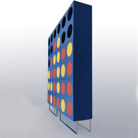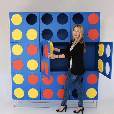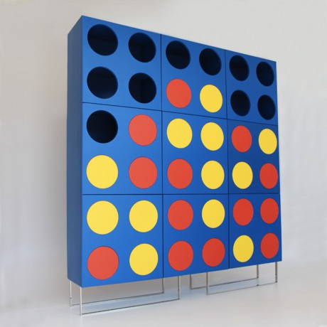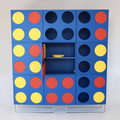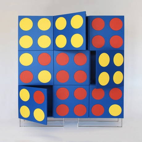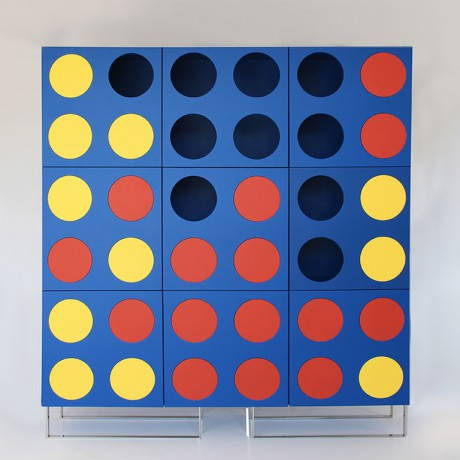 DISK36 è un elemento d’arredo disegnato da Luca Valota per E1+E4 che nasce proprio con l’intento di rievocare atmosfere dei giochi d’altri tempi. Si ispira infatti a Forza 4, un gioco da tavolo inventato e prodotto dalla Milton Bradley nel 1974. DISK36 non è solo un mobile: è un oggetto in continua metamorfosi capace di far interagire coloro che lo vivono. Come il gioco di Bradley, l’obiettivo è mettere in fila per quattro i dischi, sia in orizzontale, che in verticale e in diagonale. La citazione è evidente anche dall’uso dei colori accesi, blu e rosso, che rimandano ai colori iconici caratteristici degli anni Settanta. La verniciatura particolare, inoltre, crea un effetto simile alla scocca di Forza 4. Il gioco è possibile grazie alla presenza di 36 dischi agganciati all’anta da un meccanismo ad avvitamento interno: ciascun disco viene appoggiato dal retro dell’anta e si affranca girando in senso orario. È quindi possibile sfidarsi tra amici e familiari, oppure semplicemente disporre le fiche secondo il mood della giornata creando composizioni sempre differenti. Le gambe del mobile sono in acciaio inox lucido, e alleggeriscono la struttura portante, realizzata in legno come i dischi. www.e1e4.com
