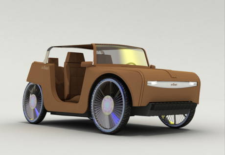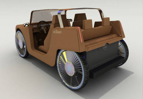 Si tratta di una vettura minimalista: senza portiere (“per stare a contatto con la natura”, spiega il progettista…), senza cruscotto integrato, senza tetto rigido, in un solo colore, realizzata con materiali leggeri e, ovviamente, a basso costo.