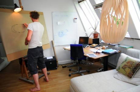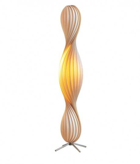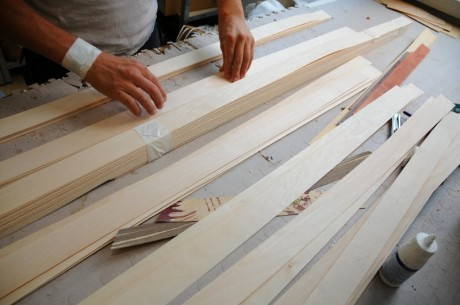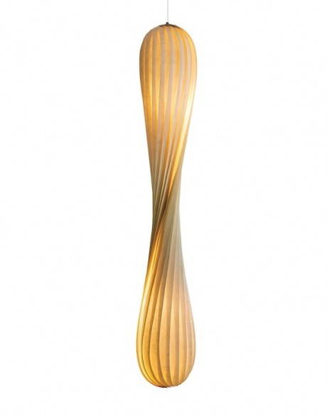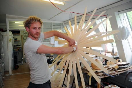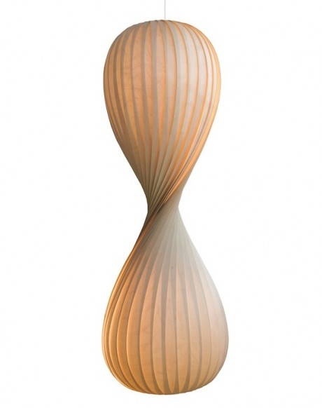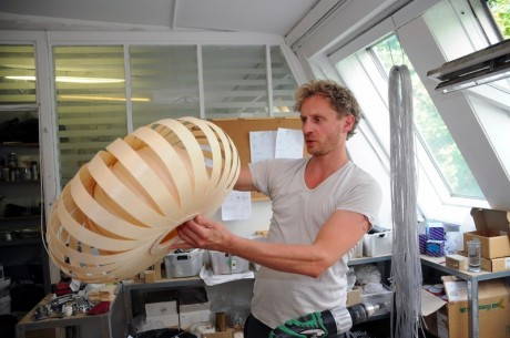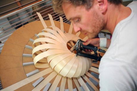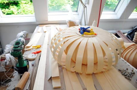 La sua tecnica è semplice. Tom prende delle lunghe e sottili striscie di legno naturale e comincia a studiarle, a arrotolarle, a piegarle fino a quando il risultato non gli dà l’emozione giusta. Quello è il momento in cui un “pezzo di legno” si trasforma in una lampada (vedi le fasi della lavorazione qui sotto…).