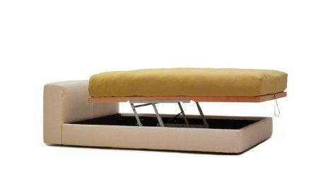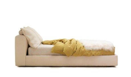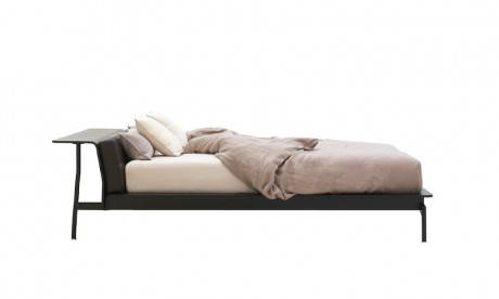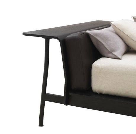 Il modello Sled di Rodolfo Dordoni utilizza tecniche di alta falegnameria nella lavorazione della testata in legno e della mensola retrostante, utilizzabile come comodino o mini-libreria da notte.