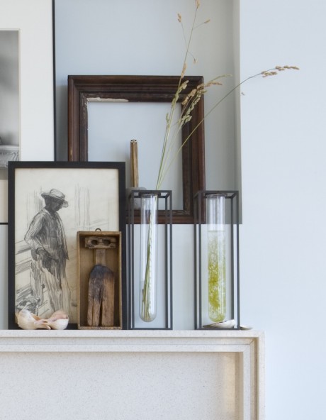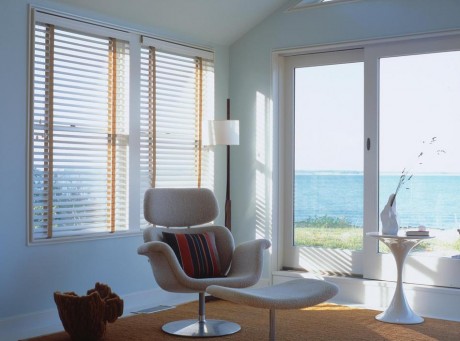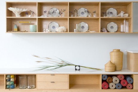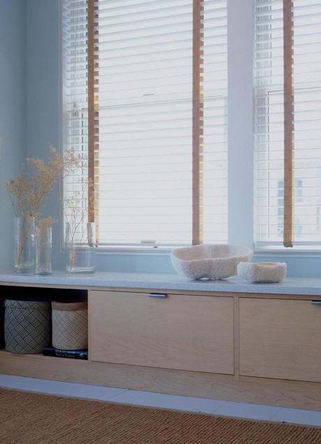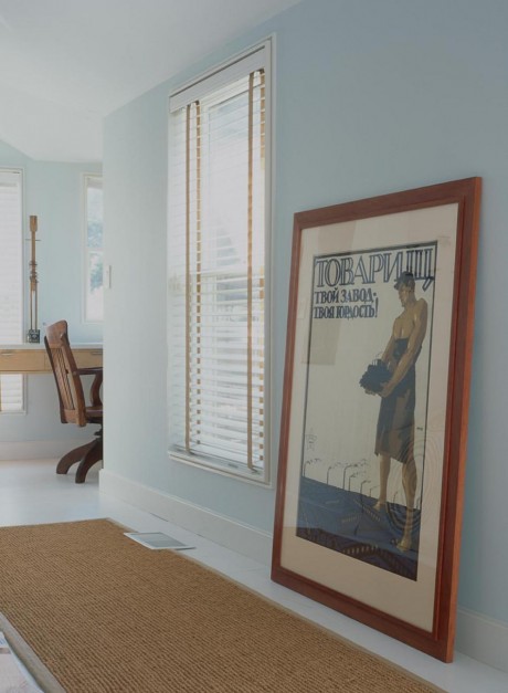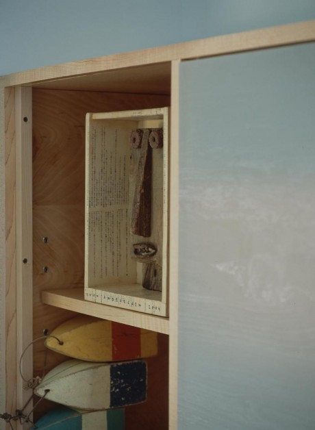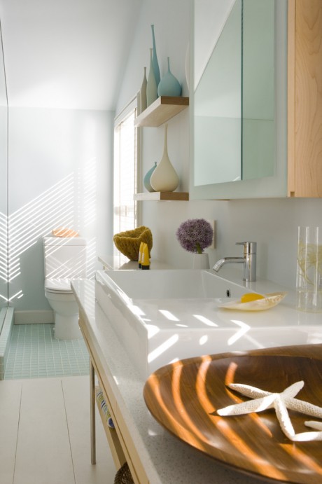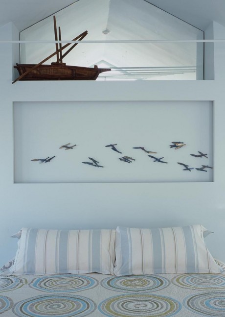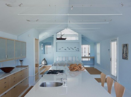 Arredi in legno chiaro e tanti oggetti di design si inseriscono in un ambiente dominato dai toni dell’azzurro, che riportano all’interno i colori del mare e del cielo.