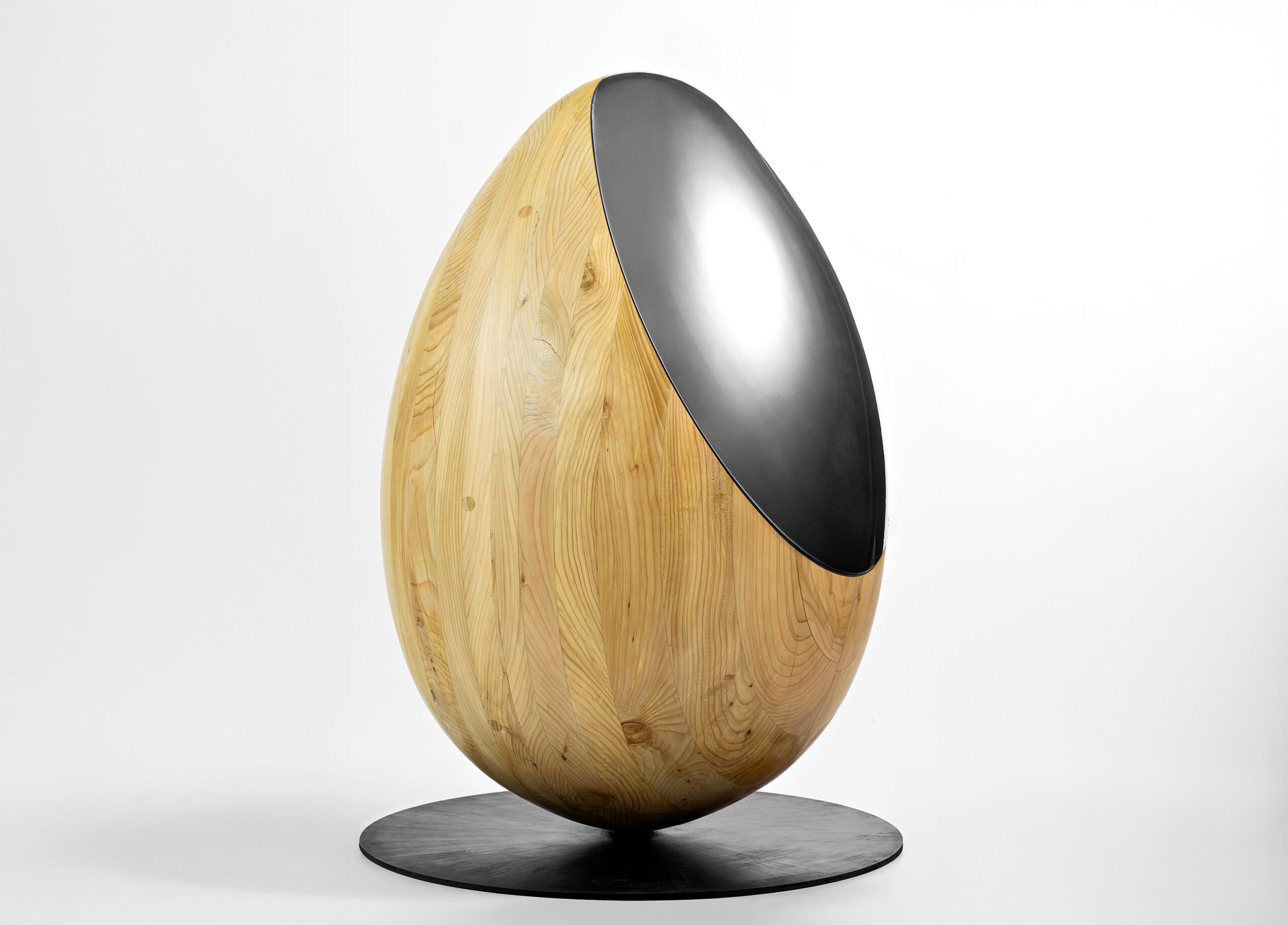 Realizzato dagli studenti di Artwood Academy, l’uovo in legno di cedro del Libano misura 140 cm di altezza, 90 di larghezza e pesa circa 150 kg. Numeri che raccontano poco: la vera sfida è tutta nella sua apparente semplicità. Un volume puro, privo di base naturale, che obbliga a risolvere questioni strutturali, di equilibrio e di costruzione con precisione quasi ossessiva.