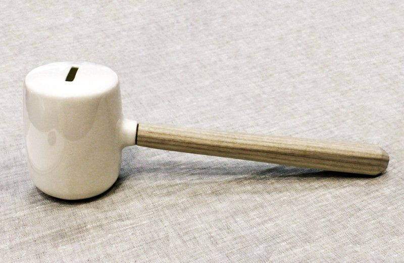 Non così se lo immaginano tre giovani studentesse della School of Industrial Design presso Università di Lund in Svezia. Karin Ekwall, Ida Kristiansen e Jiang Qian, norvegesi i primi due e cinese la terza, hanno creato infatti un inaspettato salvadanaio in porcellana a forma di martello con tanto di manico in legno. Già, un martello salvadanaio da rompere solo in caso di emergenza…