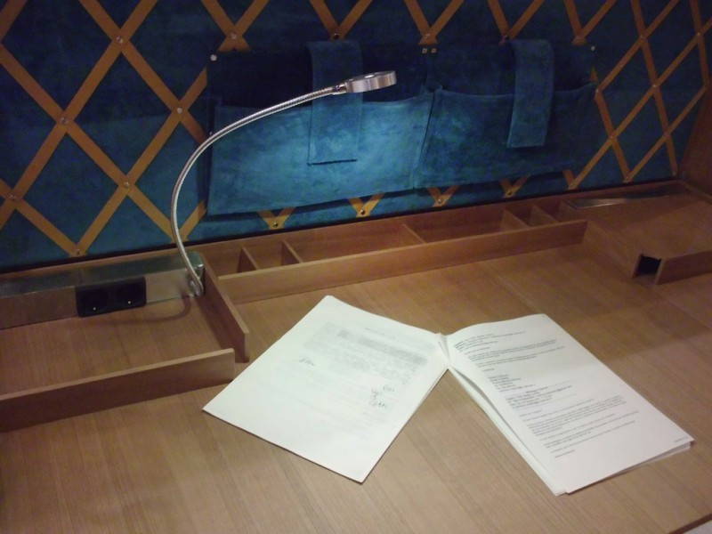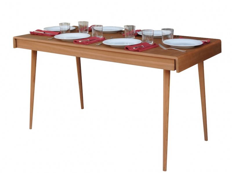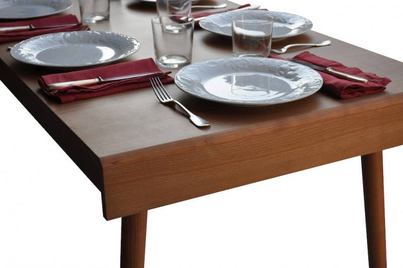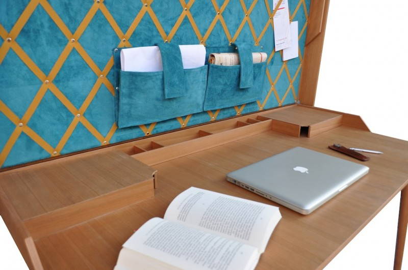Perfetto per i piccoli spazi di un monolocale così come per studi o per stanze d’albergo, una volta aperto Convertible mostra un’ispirazione anni cinquanta, evidente nella tappezzeria che riveste il lato interno del “coperchio”. Qui, tra le fasce che disegnano una griglia di rombi sul velluto, è possibile infilare promemoria e post-it, e ci sono due tasche per riporre tutto l’occorrente utile a lavorare sul piano. C’è posto per un computer, una piccola lampada, e ci sono scompartimenti perfetti per gli oggetti di cancelleria. Una volta finito di lavorare si può anche lasciare tutto in disordine, perché basta chiudere il coperchio per ottenere un tavolo da pranzo. Quell’anima un po’ vintage si nasconde sotto una superfice che fa di Convertible un complemento d’arredo di gusto minimale, pronto a ospitare fino a sei commensali.