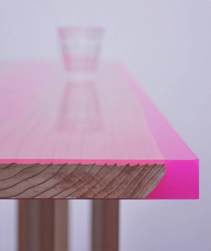 A questa nuova versione è stato dato il nome di “flat table peeled”: un tavolino essenziale fino all’estremo, ma reso molto particolare da quegli straordinari inserti in resina fluo.