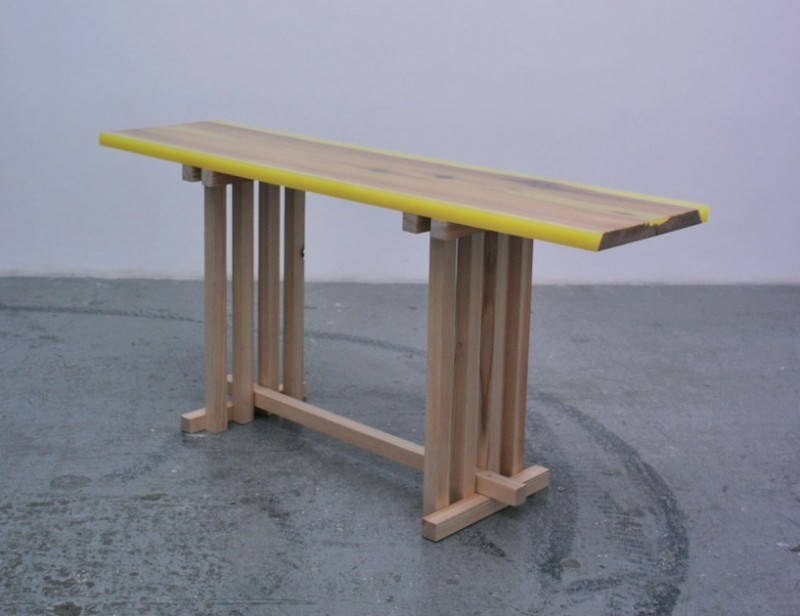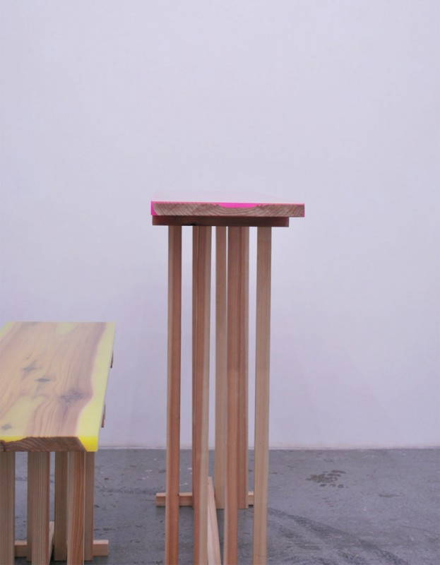 Il designer giapponese Jo Nagasaka ha reinterpretato il tradizionale tavolo “hassoku dai”, caratterizzato da otto gambe, per proiettarlo nel mondo dell’arredoper la casa o l’ufficio. Al suo predecessore, il tavolino “flat table” presentato nel 2009, è stata aggiunta una rifinitura di resina epossidica dai toni cromatici fluorescenti; in questo modo è possibile livellare tutte le irregolarità dei pannelli di legno grezzo tagliati direttamente sulla lunghezza degli alberi e usati poi come piano del tavolo.