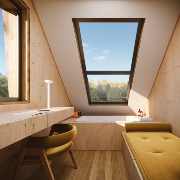 Space of Mind è un piccolo bungalow in legno di 9 metri quadrati è pensato sia come spazio per l’home office, sia come camera per gli ospiti. Come palestra dove allenarsi o come spazio privato nel quale pensare, concentrarci, rilassarci e trovare la nostra tranquillità. Un modulo abitativo da sistemate in un cortile, su una terrazza sul tetto o in un bosco. Space of Mind è riciclabile e riutilizzabile, secondo principi di sostenibilità circolare.