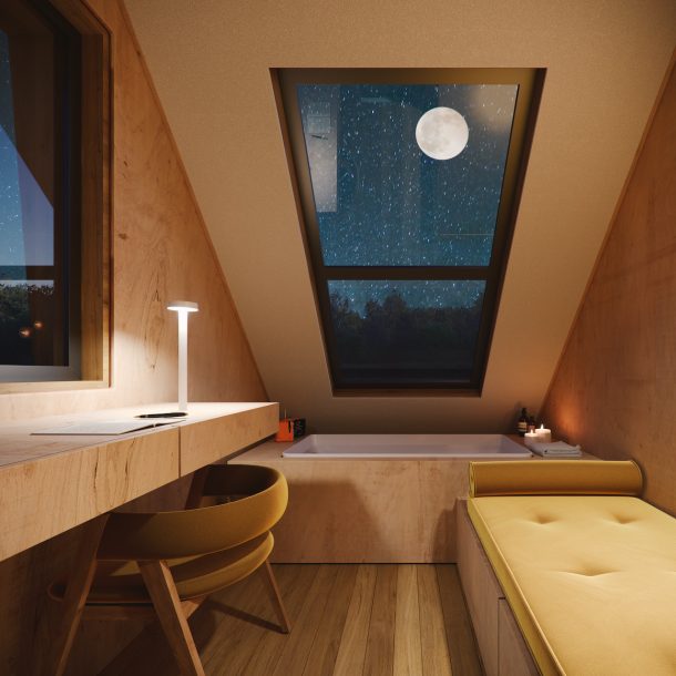 L’interno è arredato con un uno scrittoio, un divano letto del quale si può ammirare il cielo e una confortevole vasca da bagno per chi desidera concedersi una pausa di relax. (www.arcstudioperlini.com)