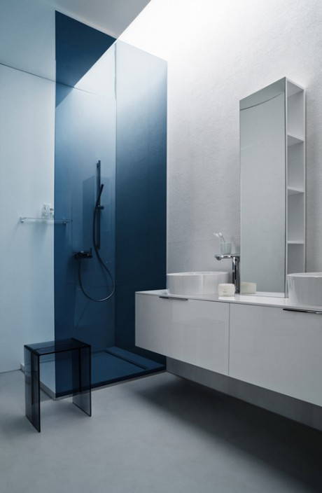 Il bagno Kartell by Laufen si configura come un’architettura integrata, un ecosistema interconnesso dove lavabi, sanitari, rubinetterie, contenitori, piatti doccia, vasche, luci e accessori convivono all’insegna della massima flessibilità; le trasparenze vitree del policarbonato di ultima generazione
