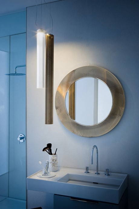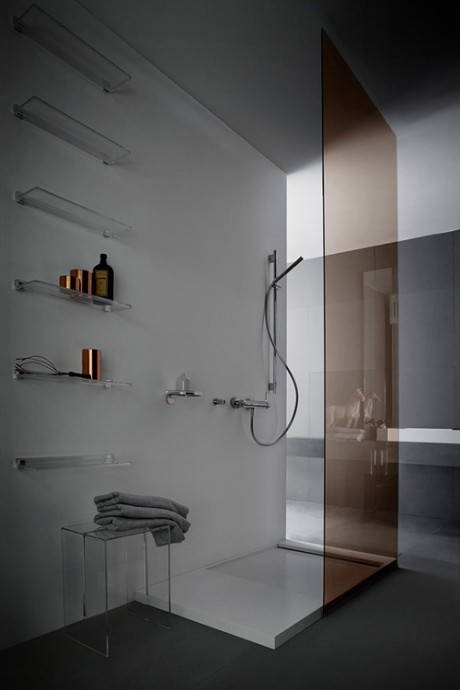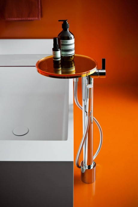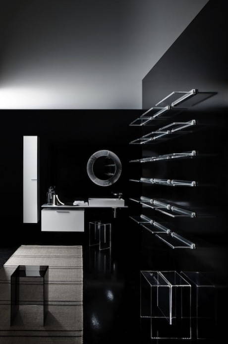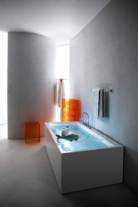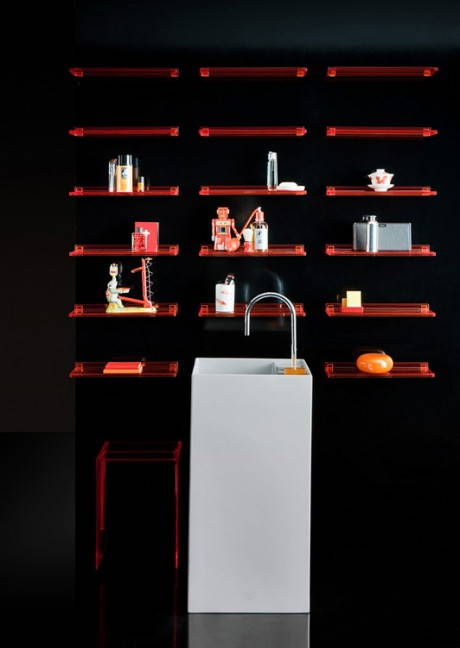 e gli spigoli secchi del lavabo totemico da terra attrarranno chi ama ambienti minimal; le plastiche ambrate, la morbidezza rotonda del lavabo, la vasca con l’acqua a sfioro sedurrà invece un pubblico più incline al decoro.