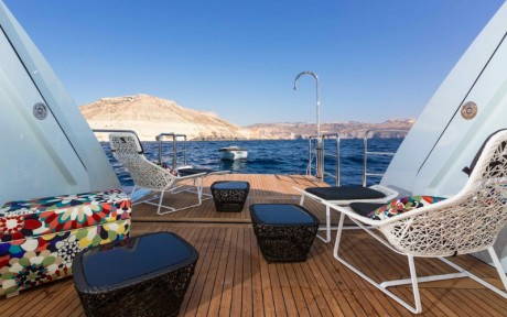 Gli ambienti si caratterizzano per un design minimalista ma accogliente e mai freddo. Quattro cabine per gli ospiti, tutte dotate di servizi di grandi dimensioni e vista sul mare garantita dall’adozione di ampi oblò. La suite Armatore è sul ponte principale a prua: un ambiente privilegiato per posizione e dimensioni, ma anche per soluzioni come la terrazza laterale impiegabile nel corso della navigazione.