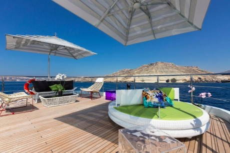 Tra le numerose soluzioni adottate a bordo di Ocean Paradise, una beach area a poppa con annessa zona relax e servizi al coperto e una piscina oversize dotata di cascate d’acqua sul sundeck, dove è sistemata anche la palestra che si affaccia sul mare.