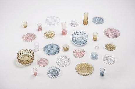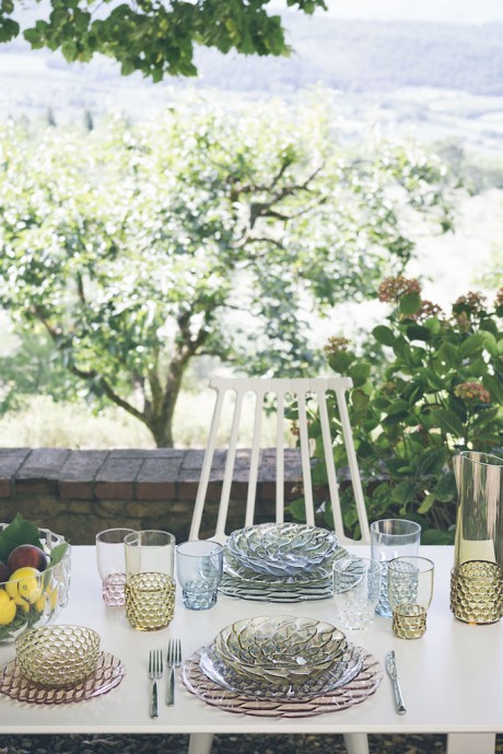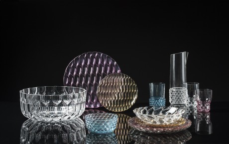 “Jellies Family”, disegnata da Patricia Urquiola per Kartell, è l’ultima nata della collezione “Kartell in Tavola”. Una linea di piatti, bicchieri e caraffe che riproducono trame caleidoscopiche disgnate sulla trasparenza cristallina della plastica.