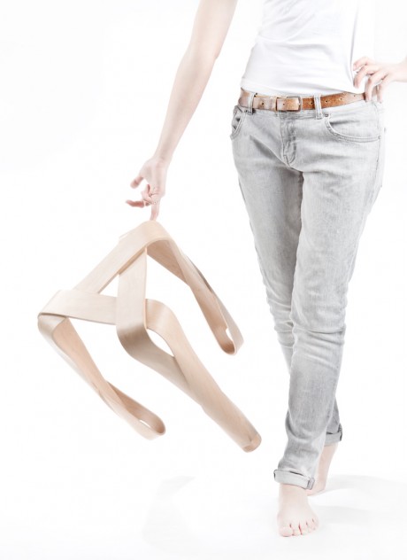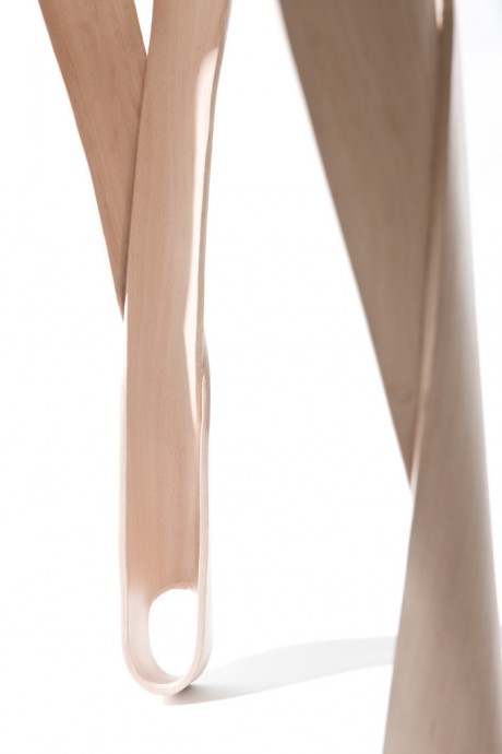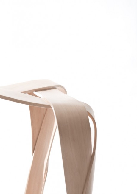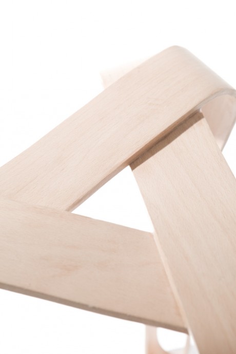 L’oggetto sembra essere realizzato con un unico ‘nastro’ di multistrato, ma in realtà il legno è stato divisa in pezzi. Ogni gamba è un modulo pressato; tre gambe sono identiche e, intrecciandosi, compongono il sedile.