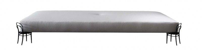 Un progetto borderline, in magico equilibrio sul labile confine che separa la dimensione artistica dal design contemporaneo. Così il progettista racconta i suoi due oggetti: “Nel creare i pezzi mi sono concesso la libertà di giocare con l’ironia e le proporzioni, pur mantenendo l’equilibrio tra l’utile e l’astratto. Come arrivare in cima alla scogliera, ma senza cadere giù. Ho cominciato la collezione “56” con due oggetti pratici: uno per il riposo e uno per il contenimento. Il punto di partenza era semplice: un morbido materasso e un contenitore di legno. Il mio compito era quello di portare ad un livello più alto il ruolo funzionale, sia letteralmente che concettualmente. Il passato è venuto in mio aiuto. Adattando la sedia Thonet n. 14, restringendola e riproducendola in acciaio, ho ottenuto la stabilità necessaria alla sua funzione di sostegno, ma destinandola ad altri componenti anziché al nostro fondoschiena.