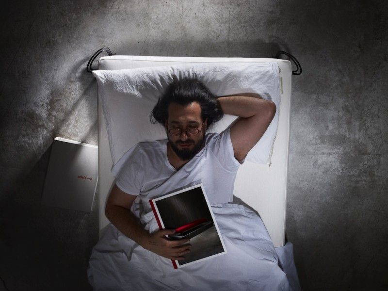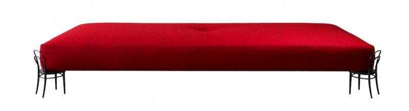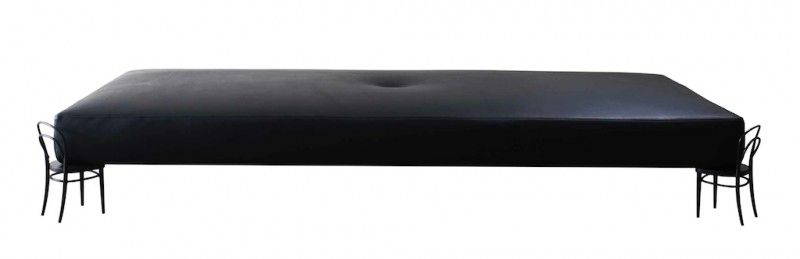 I dettagli della costruzione nel materasso e nella credenza contengono anche un’estensione dell’assurdità: il materasso evita il cliché di diventare un oggetto zen grazie al suo unico bottone centrale ( riferimento alla tecnica francese del “capitonnage”), mentre gli sportelli in legno della credenza si aprono per rivelare la sorpresa dell’interno laccato blu e dei ripiani semi fluttuanti”.
