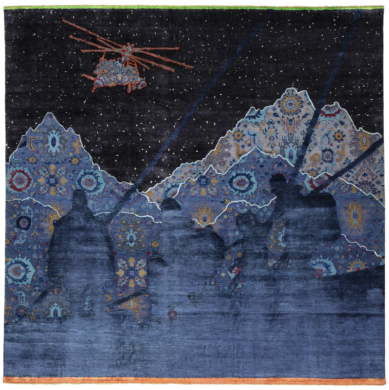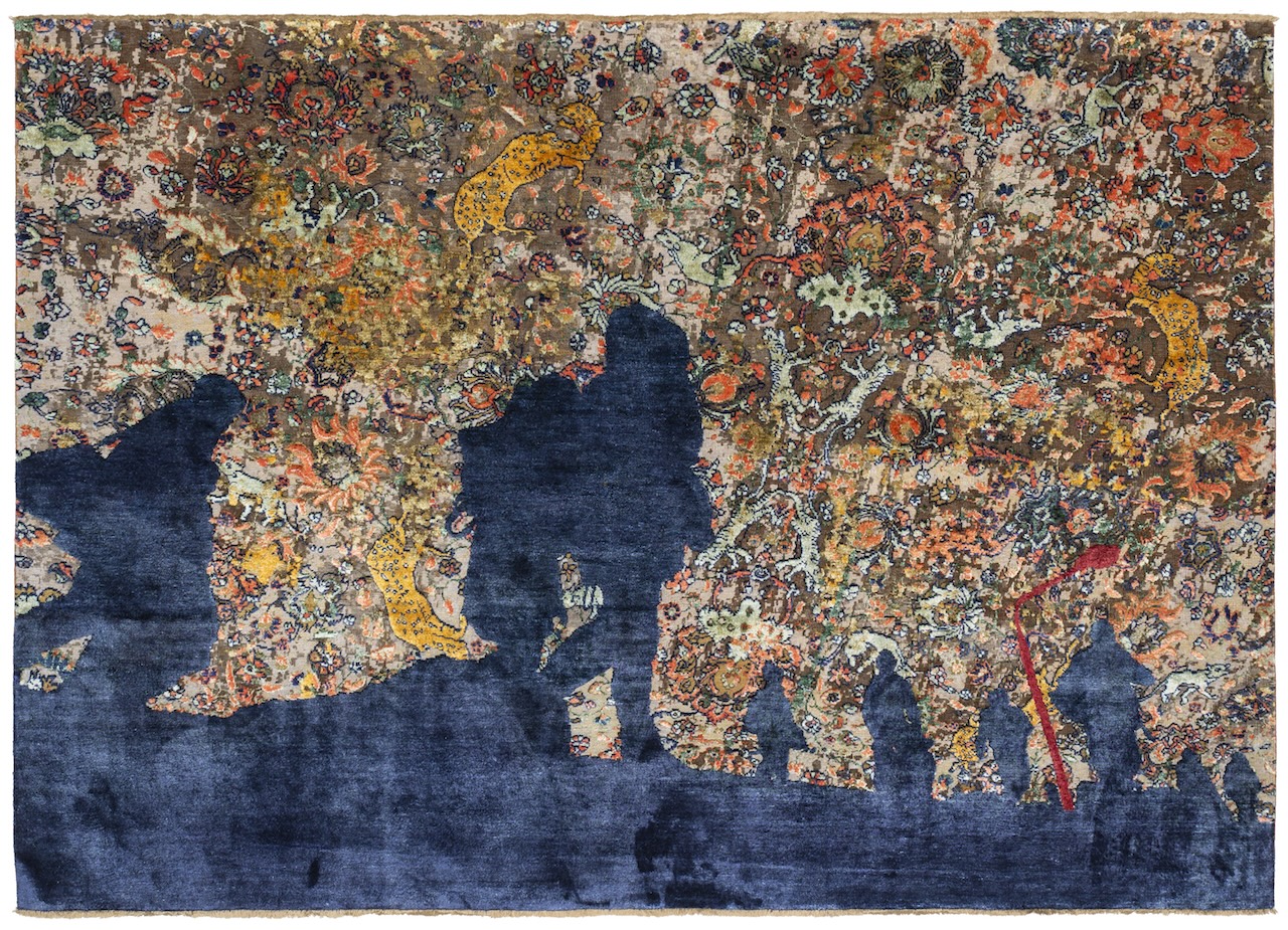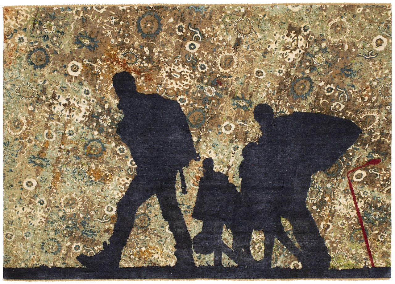 Realizzati in mesi di lavoro manuale nelle manifatture di Agra, in India, i tappeti Rug Bombs non cercano lo shock facile. Al contrario, seducono con una raffinatezza cromatica quasi ipnotica, salvo poi rivelare, a uno sguardo più attento, scene di fuga, distruzione, perdita. Sono immagini che resistono: alla rimozione, all’assuefazione, alla riduzione dell’artigianato a semplice decorazione.