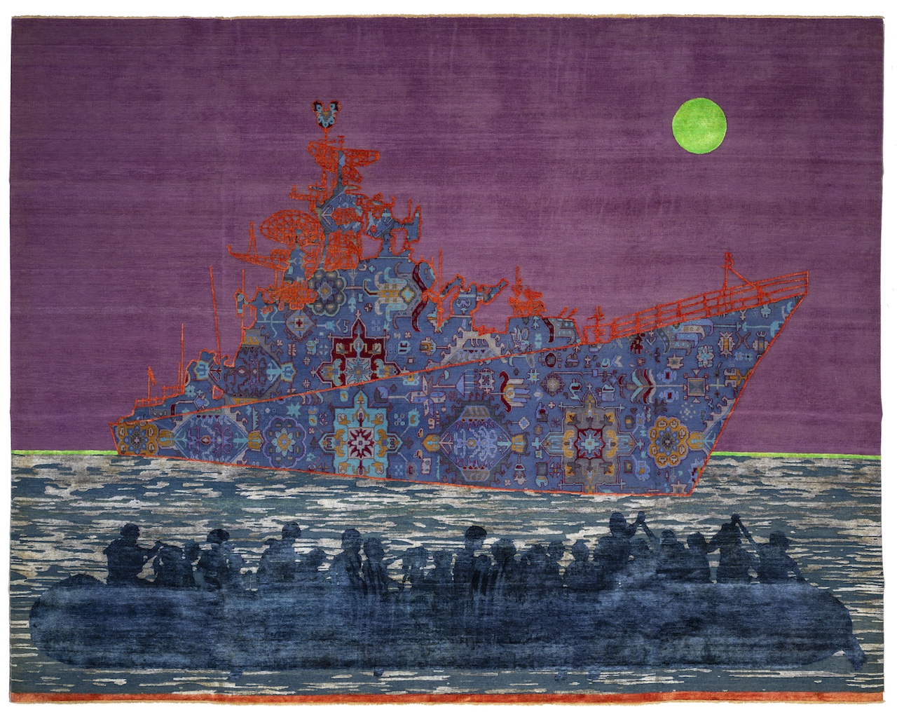 Al centro dell’esposizione, i Rug Bombs di Jan Kath: tappeti annodati a mano in lana e seta che mettono in scena navi cariche di migranti, carri armati, elicotteri militari, paesaggi feriti. Immagini che conosciamo fin troppo bene perché scorrono ogni giorno nei flussi mediatici, ma che qui si fanno lente, pesanti, tattili. E quindi impossibili da ignorare.