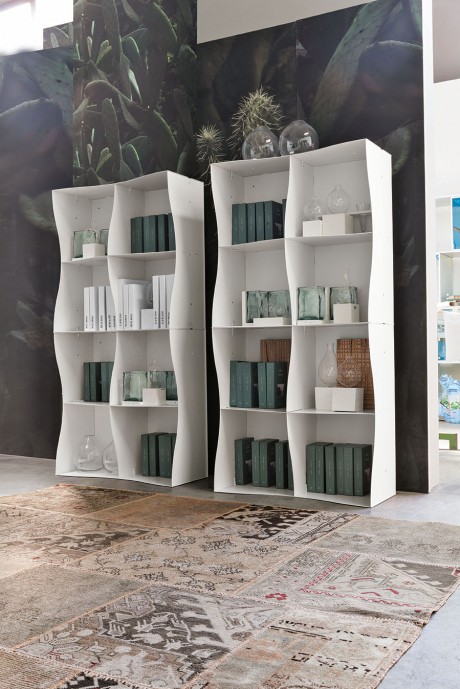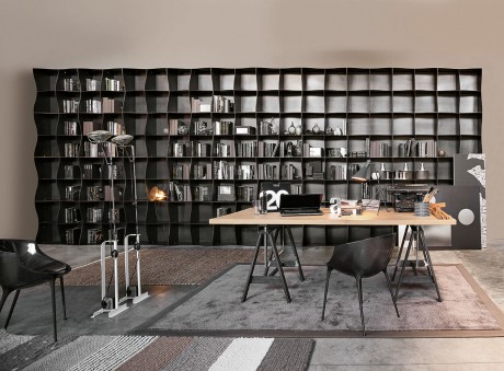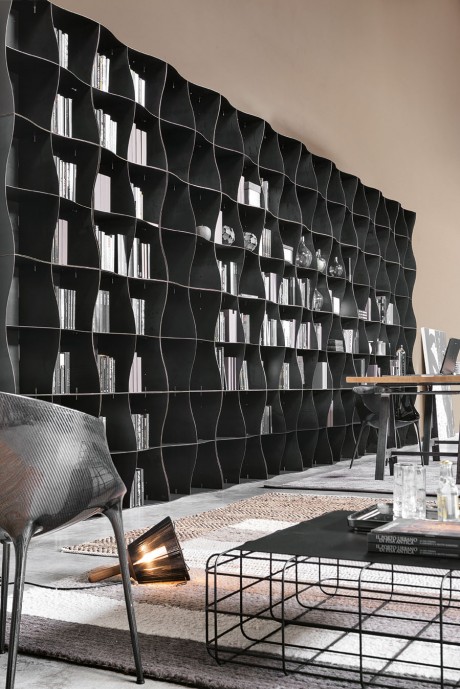 Sinuosa, versatile e materica, Iron-ic è una libreria componibile in ferro naturale basata sull’assemblaggio, ad incastro, di moduli dai lati curvilinei che conferiscono all’insieme un particolare look ondeggiante.
