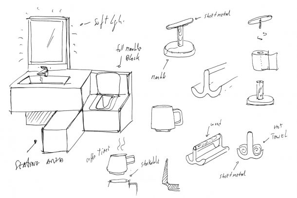 Inoltre, in linea con una tradizione giapponese, secondo la quale le persone utilizzano l’asciugamano caldo, i designer hanno pensato di proporre un vassoio che permette di mantenere il calore dell’asciugamano che può essere riscaldato in un ambiente diverso, per non venir meno al buongusto.