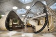 Proprio a partire da lì, Note Design Studio ha deciso di puntare sulle forme geometriche. Dal pavimento in terrazzo alle pareti e al soffitto su più livelli della reception. Dai generosi divani a forma di conchiglia fino ai paraventi con pattern a righe, geometrie di ogni sorta si mescolano, dando movimento e carattere agli interni. Mentre la palette di colori, che abbraccia tonalità come il crema, il ruggine e il marrone, contribuisce a creare un’atmosfera calda e accogliente.