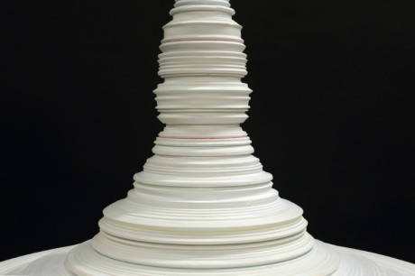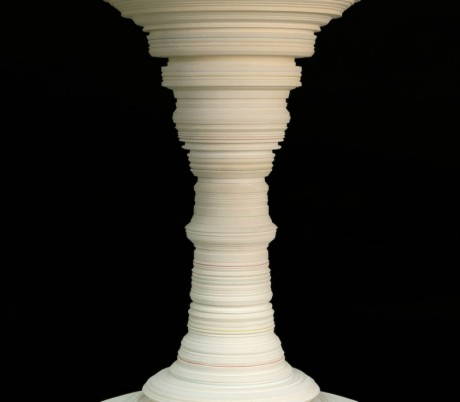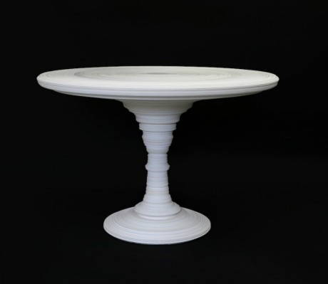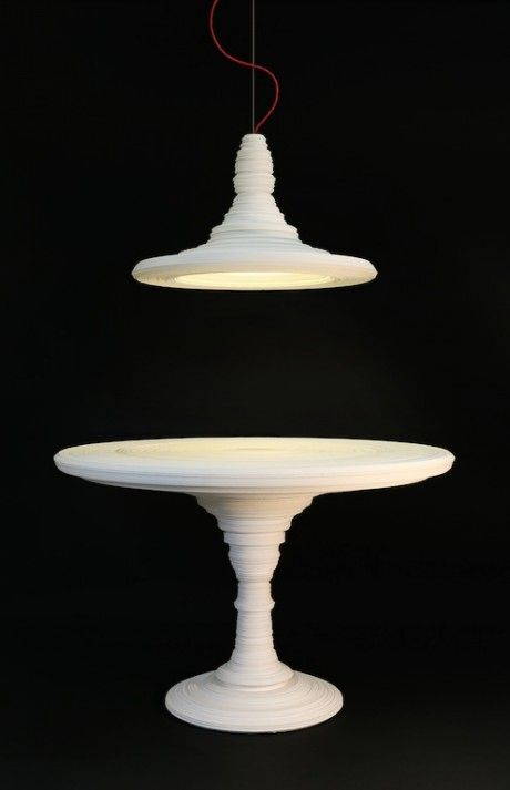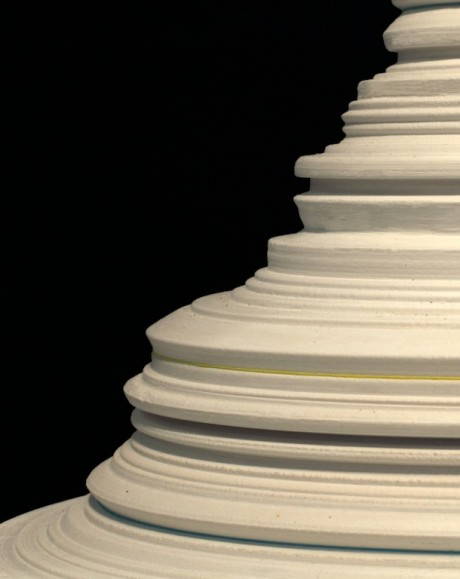 Prodotti a mano dallo studio Freshwest, Stupa Table & Light sono due oggetti che traggono ispirazione dai monumenti religiosi buddisti che costellano i paesaggi rocciosi del Tibet. Progettati per essere sovrapposti, questi due scenografici elementi d’arredo creano un’atmosfera di tranquillità meditativa grazie alla morbida luce che sembra galleggiare sopra il piano. Riprendendo gli Stupa tradizionali (che spesso sono ricoperti in fango o argilla) questi due elementi sono realizzati in gesso modellato a mano su un tornio gigante. Da lontano le linee sottili, prodotto dalla tornitura, creare una struttura molto grezza. A ben guardare si scoprono dettagli inaspettati e sottili linee di colore. Linee prodotte da una ragnatela di fili di cotone colorato, accuratamente avvolte nei solchi, che secondo l’idea dei designer fanno riferimento alle bandiere di preghiera colorate che adornano i monumenti buddisti.