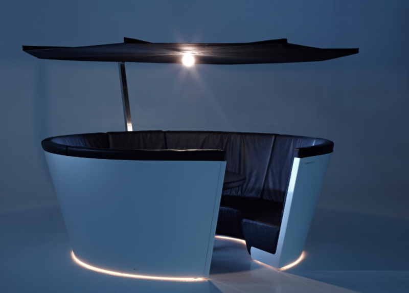 Kosmos è stato progettato per adempiere questa “missione”, e si presenta infatti come un’elegante oasi di conversazione dotata di un tavolo, poltrone e ombrellone. Wynants si è ispirato alla sua grande passione per le barche a vela scegliendo per Kosmos i materiali più tipici del mondo nautico: similpelle, alluminio, acciaio inox e poliestere hi-fi resistente ai raggi UV, tutti perfetti per un uso outdoor. Non è tuttavia da escludere anche un uso indoor, per esempio in spazi pubblici come hall e ristoranti.