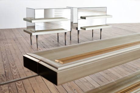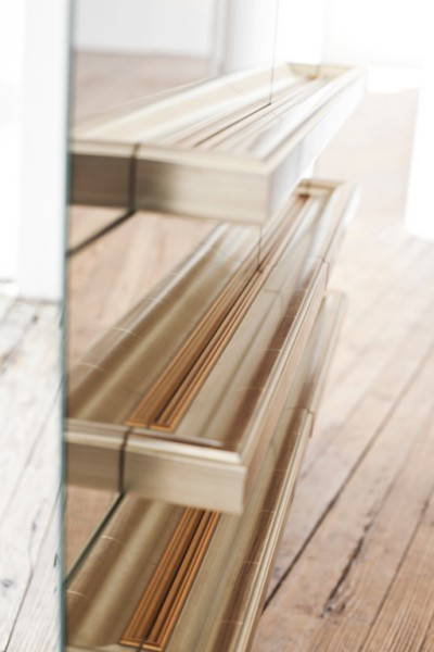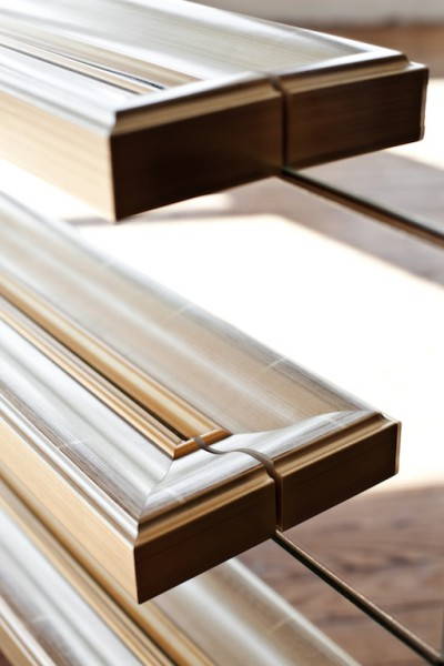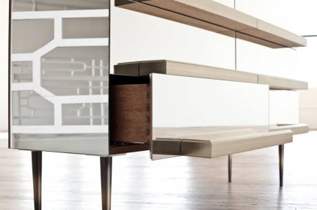 Unici elementi visibili, le gambe in acciaio con finitura bronzo antico e soprattutto le importanti maniglie disponibili in tre finiture: champagne, oro e argento dorato.