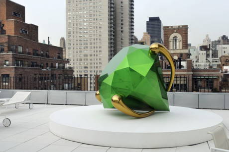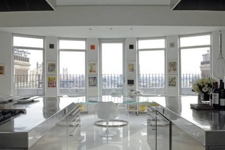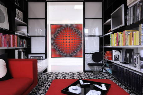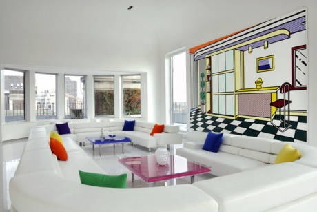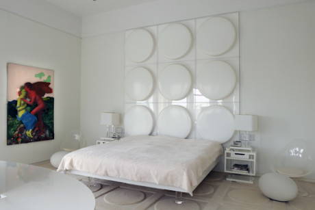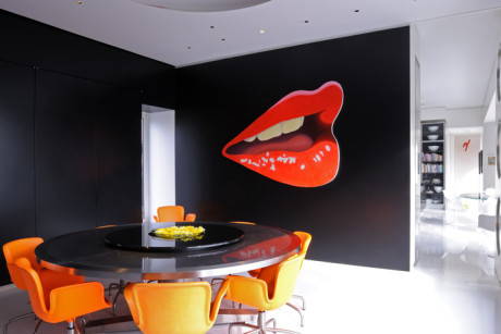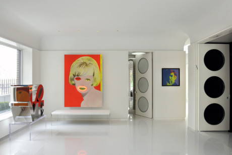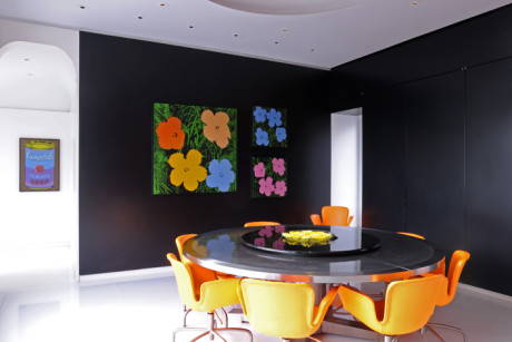 E un grande omaggio ai favolosi Sixties è anche la sua casa nella quale, su un fondo rigorosamente bianco, spiccano coloratissime opere d’arte “Pop” di artisti quali Andy Warhol, Rauschenberg, Wesslmann, Vasarely. Grandi dipinti e sculture dei più grandi artisti contemporanei ci accompagnano nella vista di questo grande attico. Fino al terrazzo, dove trionfa un gigantesco anello con smeraldo, opera dell’artista Jeff Koons.