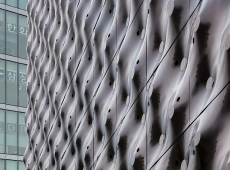 Ispirata all’Optical Art, la lamiera ondulata della facciata presenta fori irregolari che alla sera danno un immagine dell’edificio in constante divenire. Nel suo complesso, l’edificio appare come un cubo nero lucido che poggia su un piano terra interamente vetrato.
