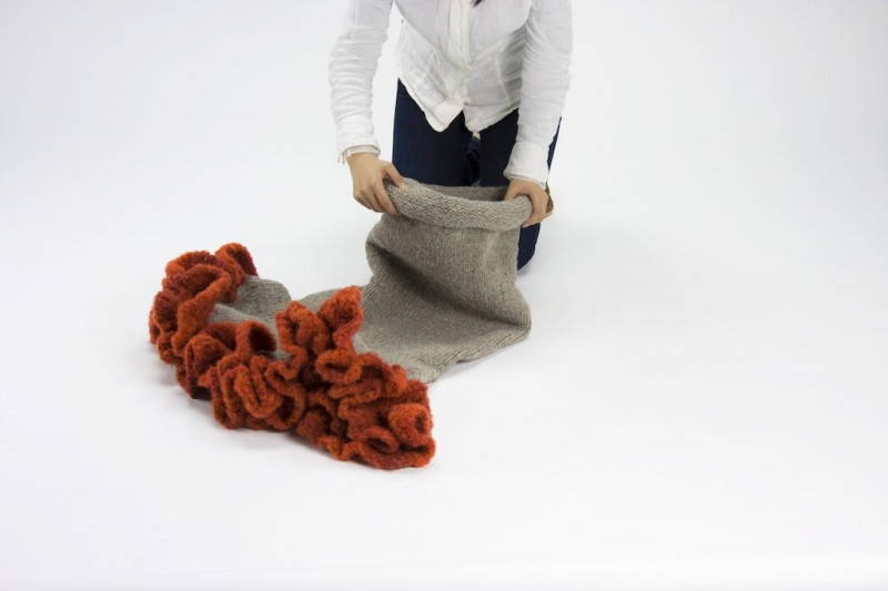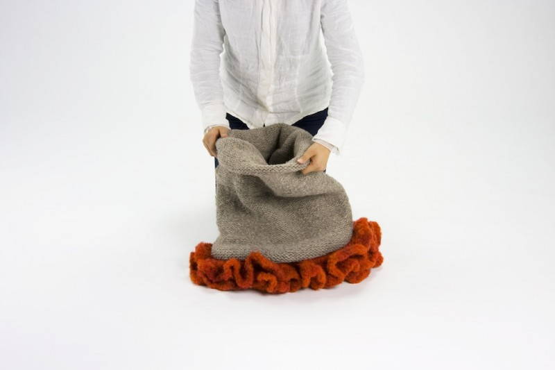 “Clytie” (Clizia) è il nome della ninfa dell’acqua che nella mitologia greca, inamorata del dio Apollo, si trasformò in Eliotropio, il fiore che segue inclinandosi gli spostamenti del sole. Questa coperta, Clizia appunto, ti tiene caldo quando si mette sulle ginocchia o quando ci si inseriscono le gambe all’interno. Se si arrotola, diventa un pouf come un fiore di grandi dimensioni. La coperta è realizzata con una maglia di filato di lana elasticizzata naturalmente dal tipo di lavorazione. La sua struttura è sufficientemente rigida da tenere sempre la forma, anche arrotolata, è estremamente morbida da fungere da comoda imbottitura ed è incredibilmente calda quando viene indossata.