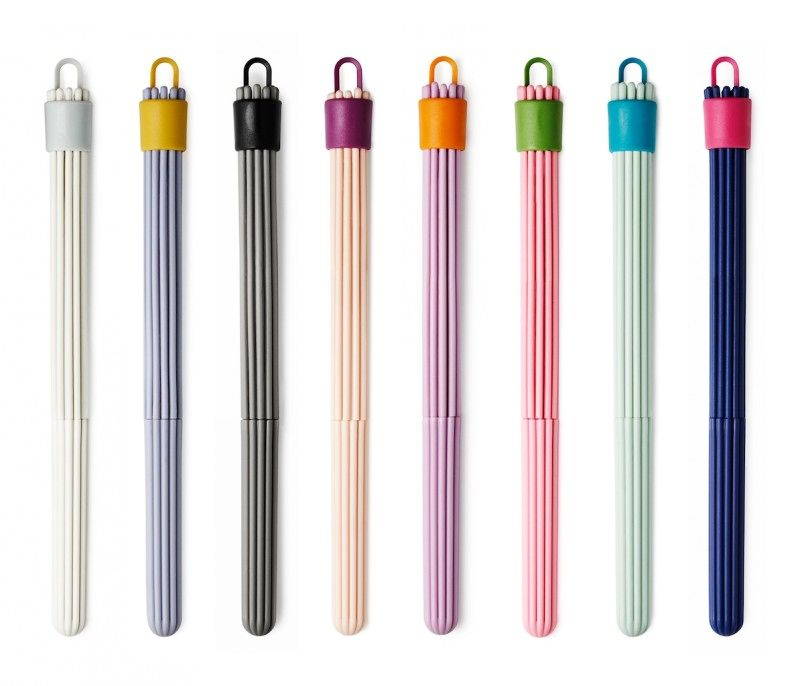 tenute assieme al centro da un anello, che serve sia da meccanismo di chiusura, sia da gancio per appenderlo, ed è disponibile in otto diverse combinazioni di colori.