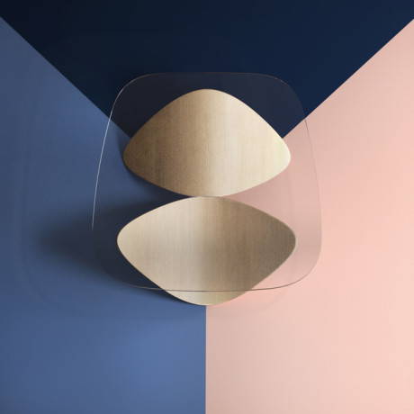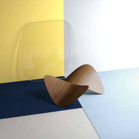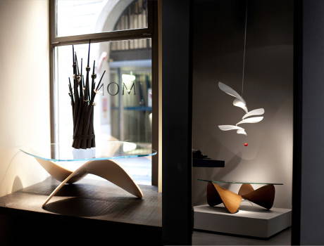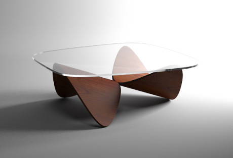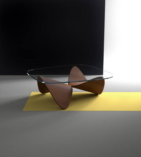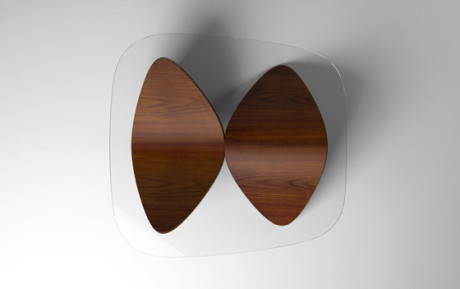 Tre sono gli elementi che lo compongono. Due elementi in legno che ne formano la base e un top in cristallo dalla forma asimmetrica. Il piano in vetro sembra sostenuto da due petali la cui linea curva e dinamica ricorda una scultura contemporanea. Un risultato davvero particolare.