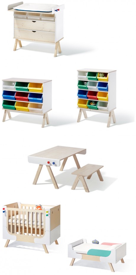 Fin qui, niente di unico… Ma la cosa veramente speciale in questa linea di mobili che si può comporre o scomporre come un gioco di costruzioni. Basta togliere i cavalletti al tavolo, girarlo a testa in giù e metterlo sullo scaffale grande per creare un fasciatoio. I cavalletti inferiori vengono utilizzati con la panca per creare posti a sedere.