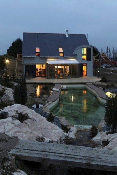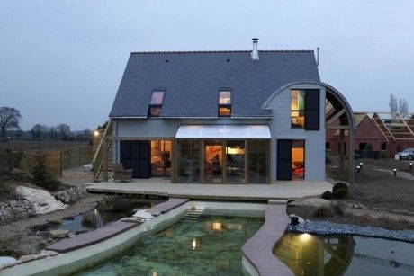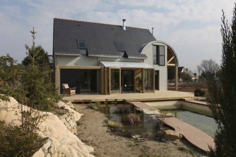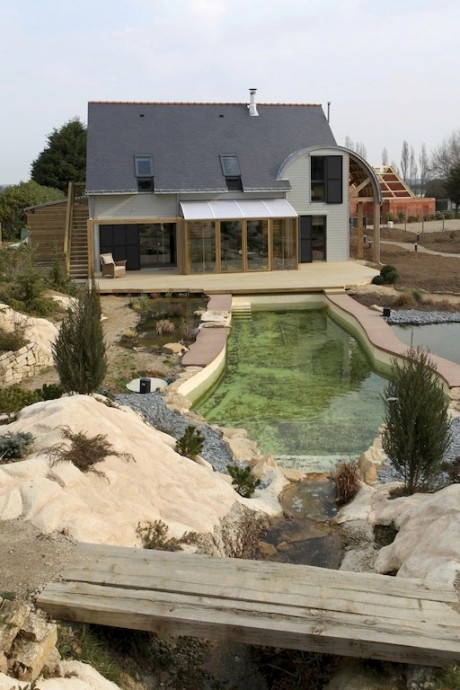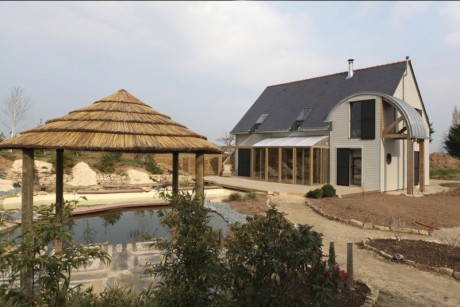 La casa è situata in una regione battuta dall’instabile clima oceanico. Il progetto è partito dal giardino, progettato per fornire una protezione dai venti di ponente e dotato di un orto nella zona più assolata. Qui sorge anche una piscina naturale, la cui acqua viene tenuta pulita in modo naturale, senza prodotti chimici.