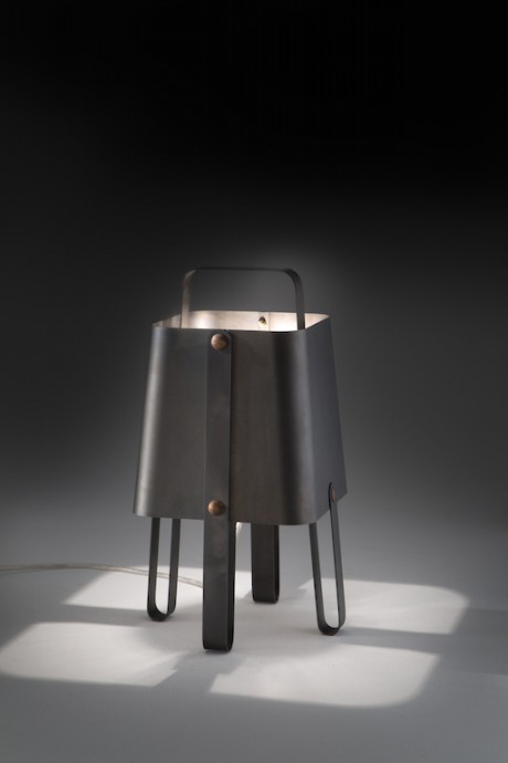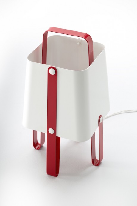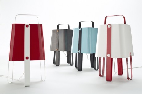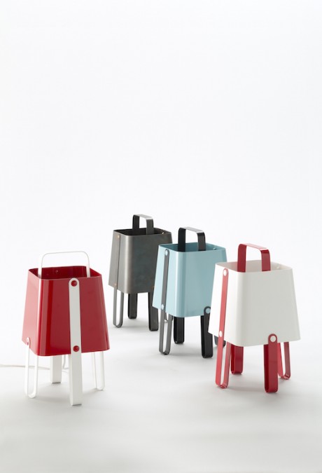 Le gambe ripiegate, continuano all’interno del paralume per trasformarsi in un manico, una comoda presa per agevolare lo spostamento della lampada. E’ disponibile in diversi colori e nella versione più “materica” in blu di laminazione.