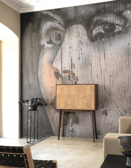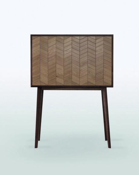 Le linee ricordano lo stile vintage, evidente nel motivo a spina di pesce sull’anta ribaltabile nelle gambe dalla forma sfaccettata.