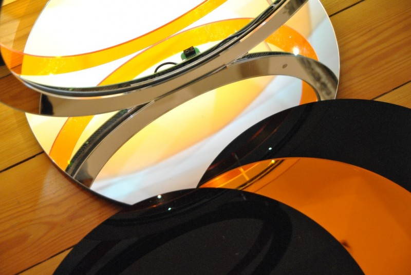 “Durante l’assemblaggio della prima lampada ci siamo resi conto che la sua realizzazione produceva molto materiale di scarto. Abbiamo quindi iniziato a pensare a come riutilizzare gli scarti. I dischi di plexiglass hanno trovato immediata collocazione a copertura della base. Gli scarti del ferro, sono invece stati rilavorati, per ricavare la base, le giunzioni, i punti di fissaggio per i magneti e tutta una serie di particolari metallici.