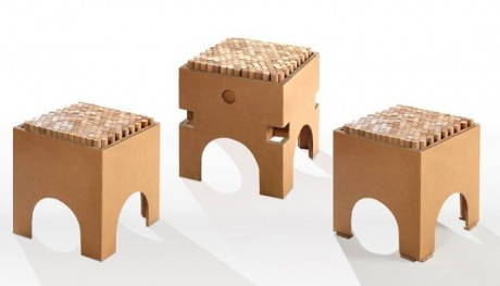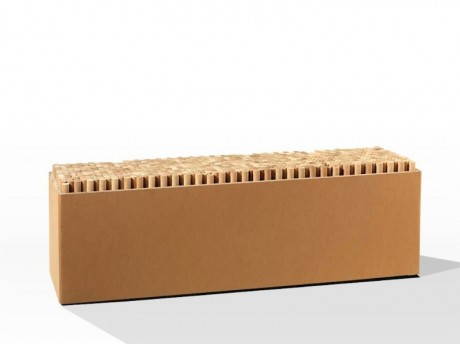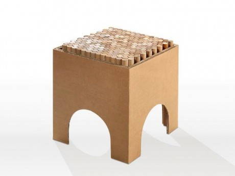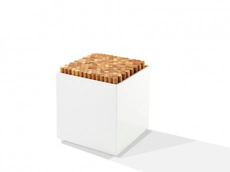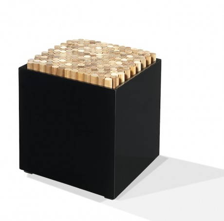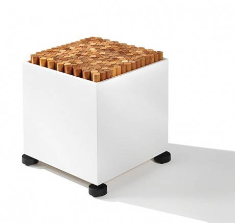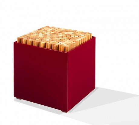 Lo stesso principio della Trave è stato utilizzato per la collezione “Cubico”, una serie di pouf dalle linee minimaliste in legno laccato, e per la linea “Scatola”, pouf e panca realizzate con un materiale povero come il cartone. Il pouf ha circa 250 cilindri in legno mobili.