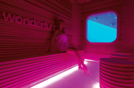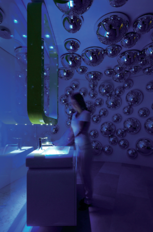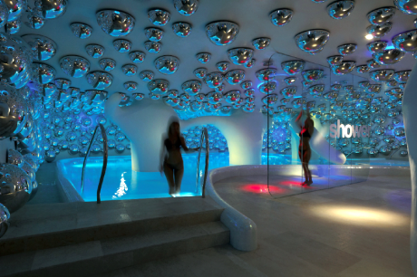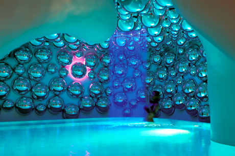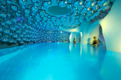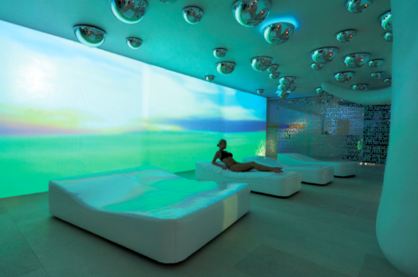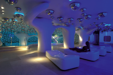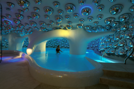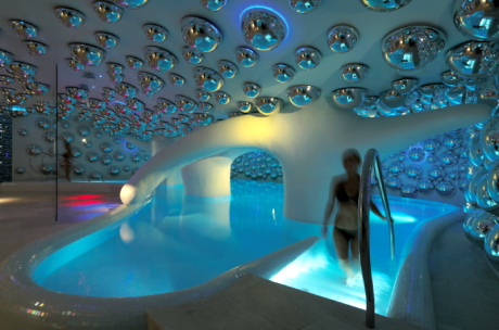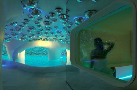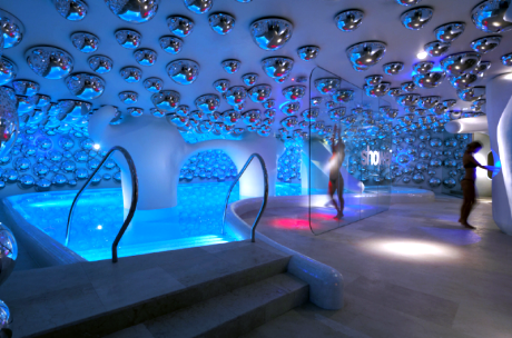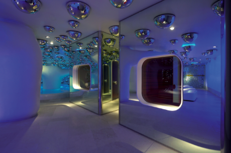 Specchi a bolle dai richiami psichedelici che pendono dai soffitti bianchi; linee sinuose, mosaici, altissima tecnologia. È la Swisse Spa del Boscolo Hotel di Milano disegnata da Simone Micheli.