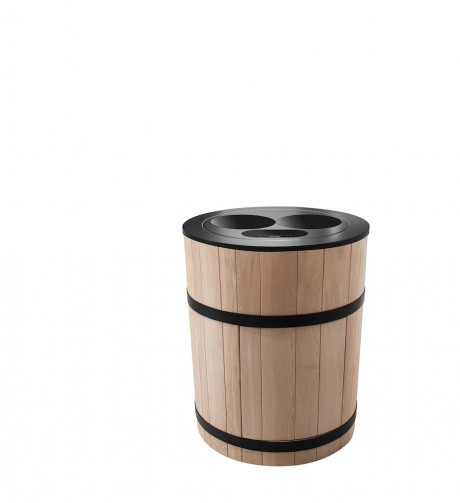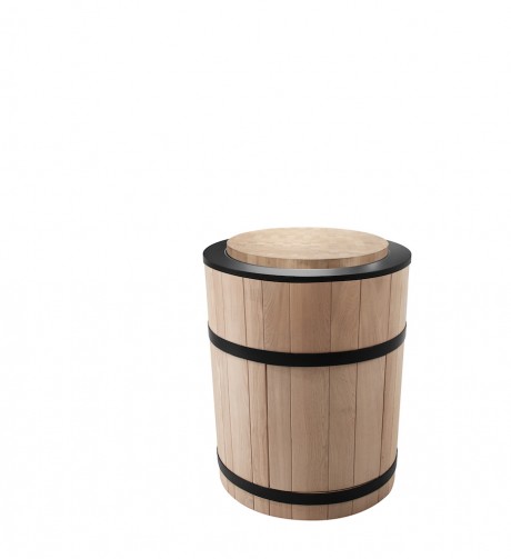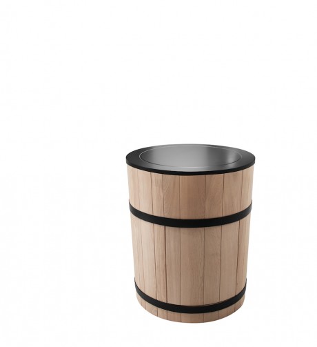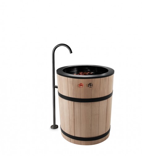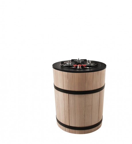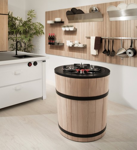 La base della Tinozza di Minacciolo è stata realizzata in un rovere chiaro naturale abbracciato, proprio come una botte, da fasce in acciaio nero e può essere sormontata da un classico piano cottura a gas con tre fuochi, ma anche da un piano a induzione, un piano in vetroceramica o da una più moderna piastra Teppan-Yaki. Inoltre può essere usata abbinata ad altri moduli con lavabo, tagliere e tante altre funzioni.
