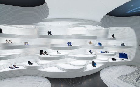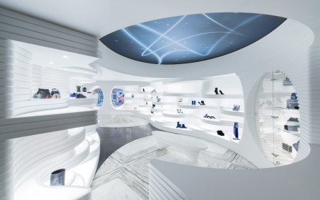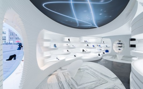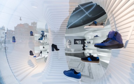 Situato nella piazza Koningsplein, nel cuore di Amsterdam il negozio offre un’immagine rivoluzionaria, futurista, quasi un’astronave da science-fiction. Un suggestivo effetto onda si diffonde tutt’intorno all’interno del negozio partendo dalla vetrina, sviluppando un gioco dinamico di linee che formano superfici ricurve di diverse altezze e dimensioni, tutte evidenziate da un sistema di illuminazione integrata.