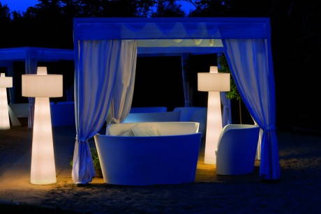 Up è disponibile nel colore bianco-avorio e per la versione da interni sono disponibili degli accessori “tricot” in lana lavorata a coste beige oppure rosso, da mettere come rivestimento al paralume dal diametro di 60 centimetri.