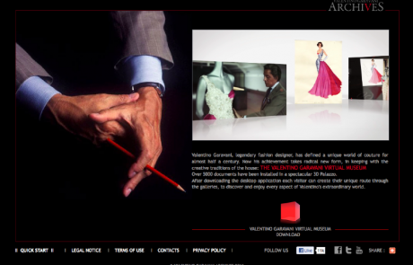 Dallo scorso dicembre Valentino è sbarcato” sul Web con il suo straordinario Museo Virtuale in 3D. Un’intera raccolta di documenti che testimoniano l’alta moda e l’esclusivo made in Italy per eccellenza dalla Maison. È inevitabile emozionarci dinanzi alle bozze disegnate, agli schizzi, alle più belle campagne pubblicitarie, ai ritratti dei fotografi più illustri del nostro secolo. Una volta entrati nel Virtual Museum, possiamo decidere quale percorso intraprendere. Una full-immersion nel mondo Valentino che ci offre diverse sezioni, accompagnati da atmosfere e sottofondi musicali, proprio come nelle favole!!!