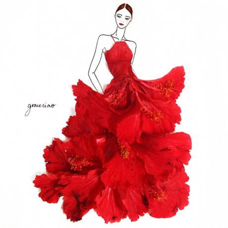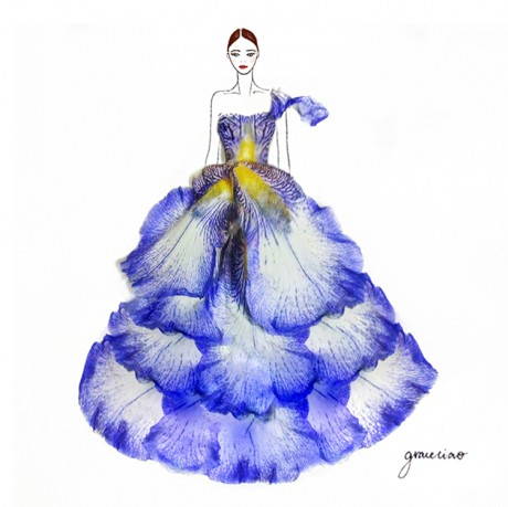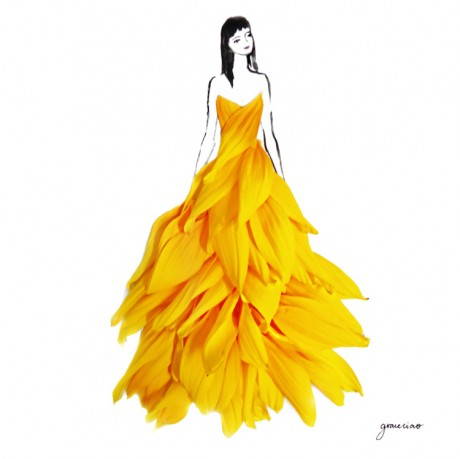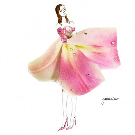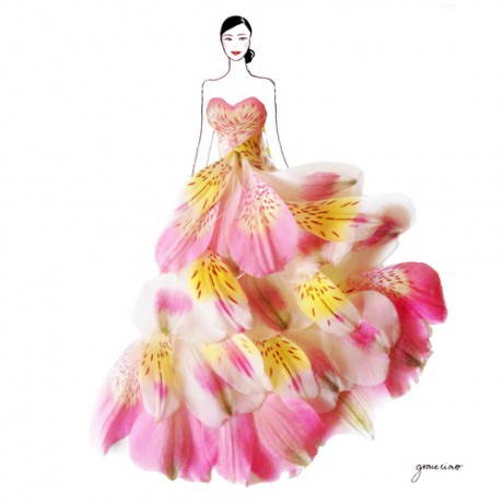 Ma in realtà sono frutto di grande cura per i dettagli ed un gusto ben determinato. Ad un tratteggio molto elegante e minimale con cui sono disegnati i corpi longilinei delle modelle vengono uniti petali di fiori diversi che formano gonne e vestiti dalle sfumature e dal panneggio tridimensionale e tattile. Colori e forme abbinati con sapienza, per un nuovo linguaggio che sembra trasmettere il profumo e arrivare ad emulare l’alta moda. Sbirciate qualche idea e magari create qualche modello profumato e colorato anche voi!